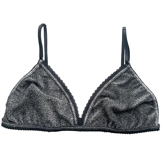 Modèle conçu en France mais réalisé et découpé à la main dans mes ateliers familiaux en Argentine. Soutien Gorge Triangle lurex argent bordé de lurex argent (90% Polyamide,10% Lurex). Il s’adapte à chaque poitrine grâce à l’élasticité du tissu. Agréable au toucher et confortable à porter. Un jolie dessous dessus.